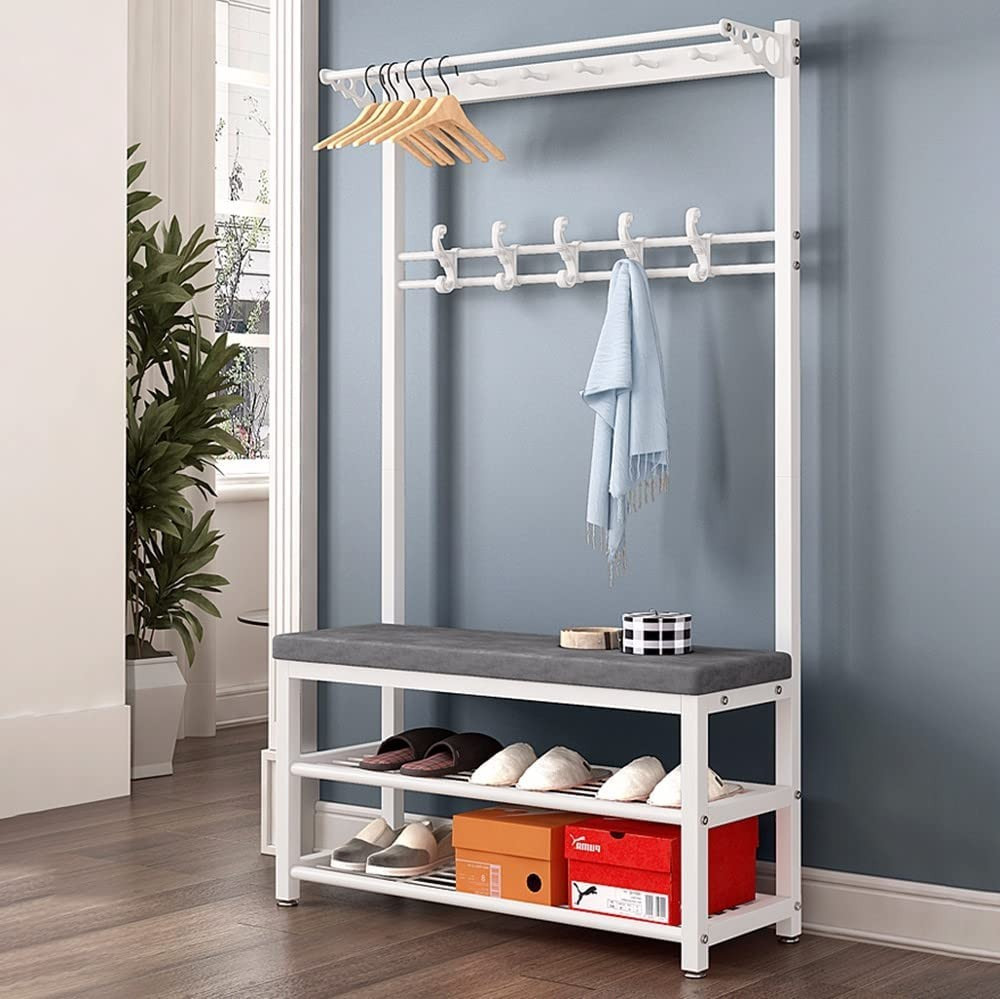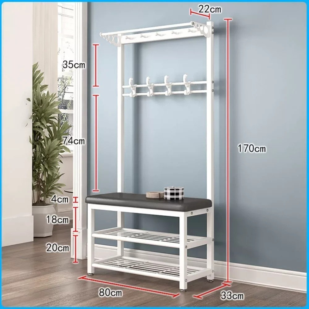Nechybí ani dvě poličky na odkládání bot a v horní části si kabáty a tašky můžete nechat na ramínkách a dvou řadách ramínek. Jeho 4 cm silná, měkká, polstrovaná část slouží jako pohodlné sezení při obouvání a zouvání.