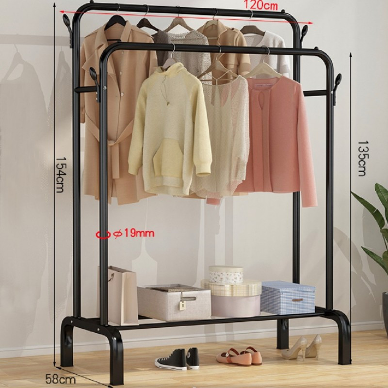 Na šatníku jsou dvě police na boty, na vrchní části jsou ramínka a na obou stranách jsou závěsy na oblečení. Jeho lehká konstrukce a kolečka na spodní straně umožňují snadnou manipulaci a přemístění.