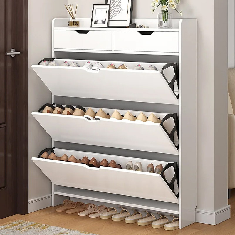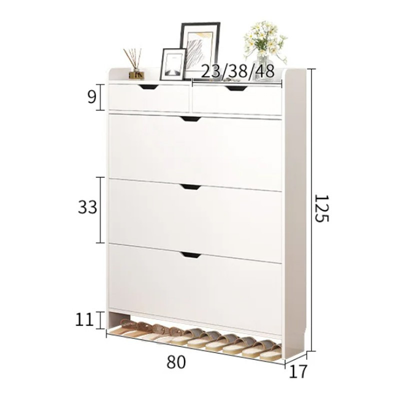 Jedinečný kus nábytku do předsíně s pohodlným úložným prostorem pro boty a doplňky. Tato skříňka na boty představuje nadčasový styl. V horní části se nacházejí 2 praktické zásuvky s ideálním úložným prostorem. Spodní část má tři police na boty. Navrženo speciálně pro skladování suché obuvi. Má „houpací“ dveře, které se otevírají shora dolů.