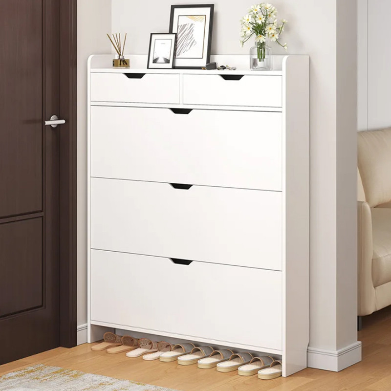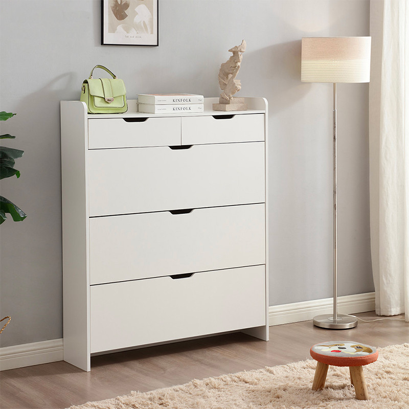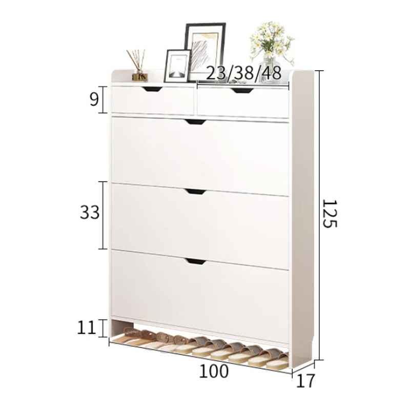 Jedinečný kus nábytku do předsíně s pohodlným úložným prostorem pro boty a doplňky. Tato skříňka na boty představuje nadčasový styl. V horní části se nacházejí 2 praktické zásuvky s ideálním úložným prostorem. Spodní část má tři police na boty. Navrženo speciálně pro skladování suché obuvi. Má „houpací“ dveře, které se otevírají shora dolů.