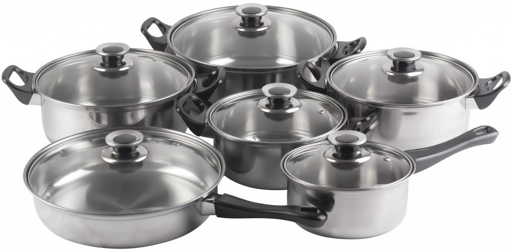 12dílná sada nerezového nádobí plastovými držadly a skleněnou poklicí.